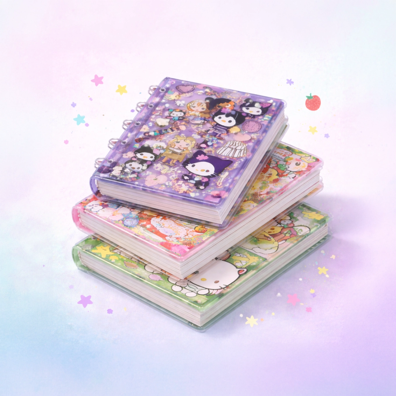 Handmade shaker notebooks with glitter, charms, and magical creativity.